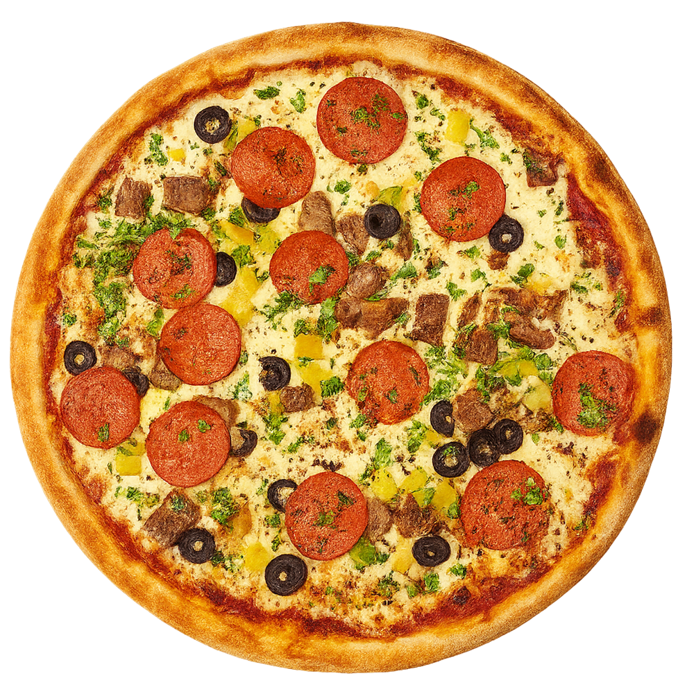Соус, Сыр моцарелла, Говядина, Маслины, Пепперони, Болгарский перец. 32см.