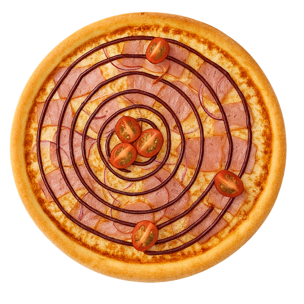 Ветчина, Бекон, Красный лук, Помидор черри, Пицца соус , Соус барбекю, Сыр моцарелла