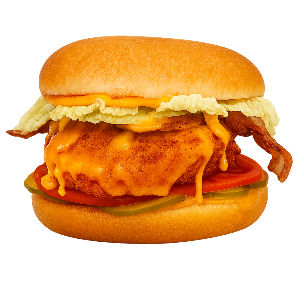 Булочка, куриное филе в панировке, обжаренный бекон, плавленный Чеддер, соус "Калифорникейшн", огурец маринованный, салат, помидор, репчатый лук.