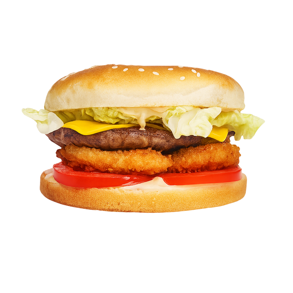 Булочка, Говяжья котлета, Тигровые креветки, Помидор, Салат, Сыр Hohland, Тейсти соус