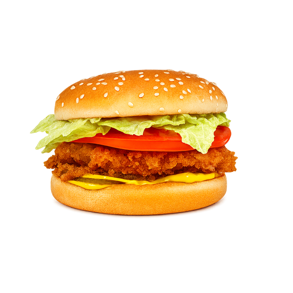 Булочка, куриное филе в хрустящей панировке, острый маринованный огурец, соус "Карабас барбекью" соус "Копченный" хрустящий лук, салат, помидор.