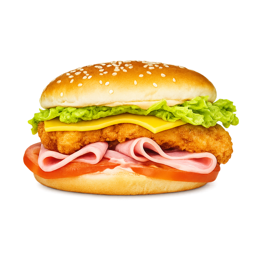 Булочка, Куриное филе, Ветчина Помидор, Сыр Hohland, Салат, Бургер соус.
