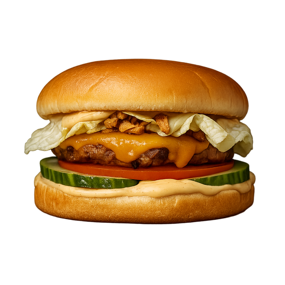Оленина, говядина, хрустящий лук, огурец, помидор, сыр, салат, соус