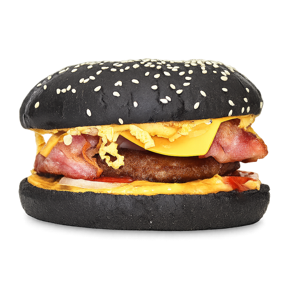 Чёрная булочка, Соус БИГ- Мак, Говяжья котлета, Бекон, Салат, Лук, Помидор, Сыр Hohland