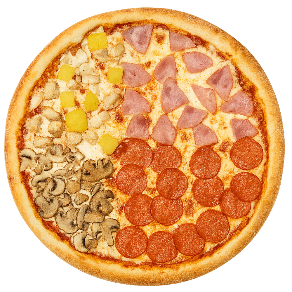 Соус, Сыр моцарелла, Курица, Ананас, Пепперони, Ветчина, Шампиньоны. 32см.