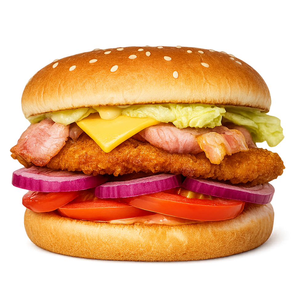 Булочка, Куриное филе, Бекон, Бургер соус, Салат, Помидор, Маринованный лук, Сыр Hohland