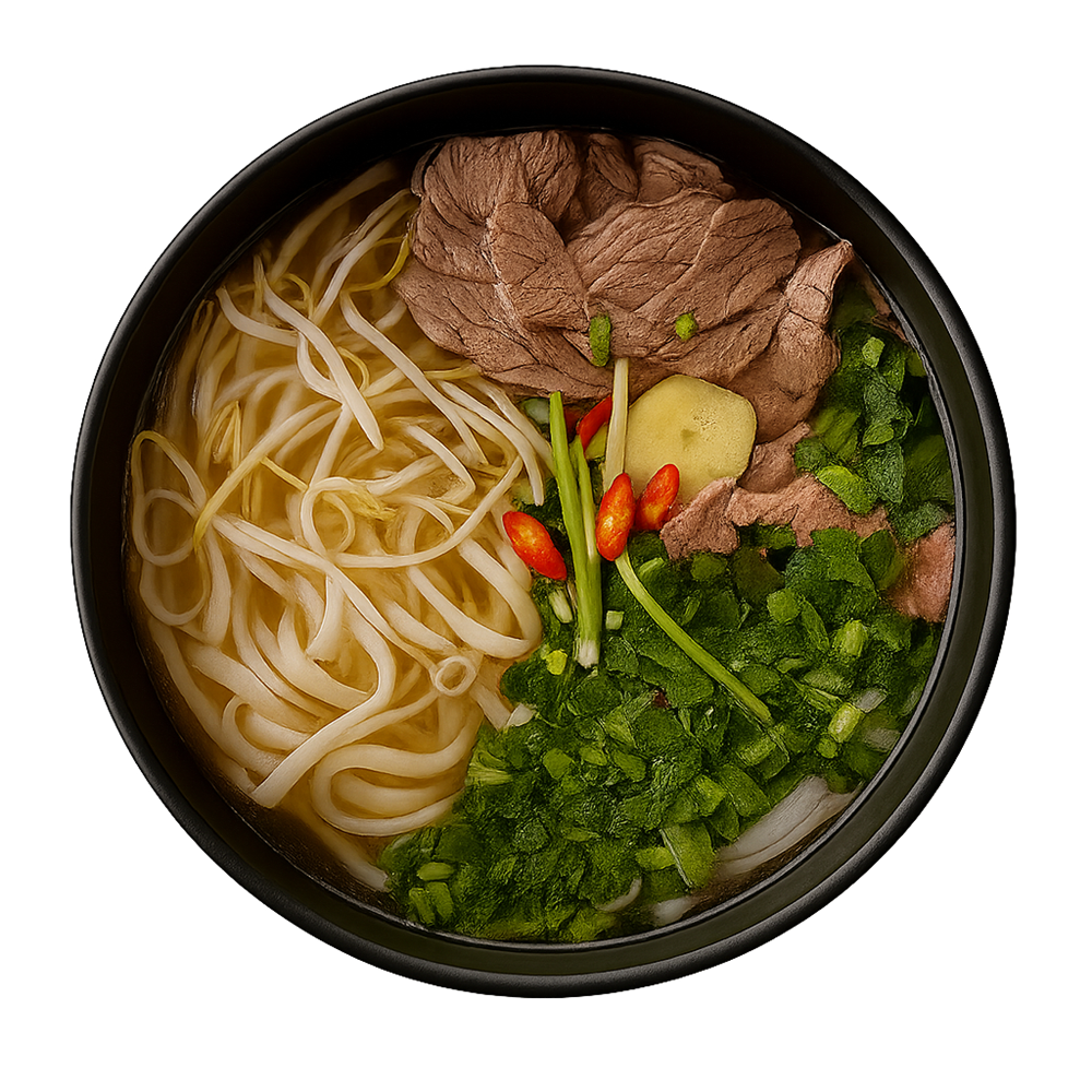 Говядина, рисовая лапша, кинза, зелёный лук, перец чили, лук красный, соус острый.