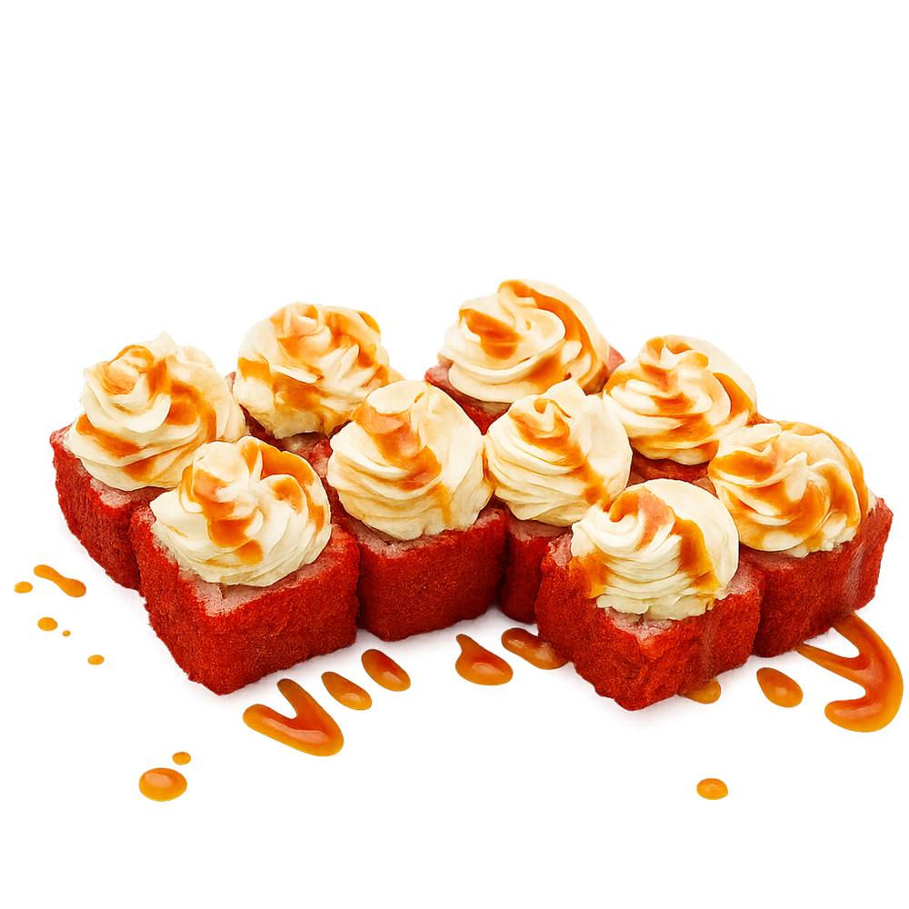 Рис, Копчёное куриное филе, Крем краб, Жареный бекон, Огурец, Укроп, Сливочный сыр, Паприка, Соус Кимчи 8шт
