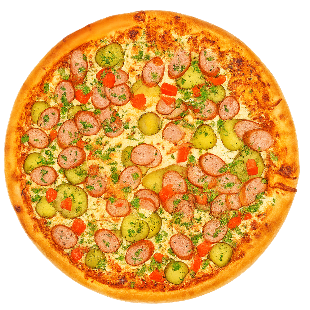 Соус, Сыр моцарелла, Колбаски охотничьи, Помидор, Огурец маринованный, Чеснок, Зелень. 32см.