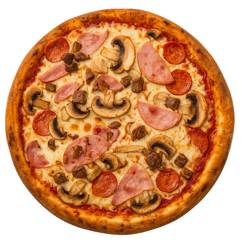 Пепперони, Ветчина, Шампиньоны, Соус, Сыр моцарелла, Сыр пармезан. 32см.