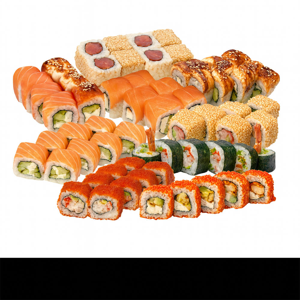 Эби темпура, Филадельфия, Дракон, Калифорния с крабом, Сливочный ролл, Москва, Z-ролл, Спайси ролл с магуро, Спайси ролл кани 68шт.