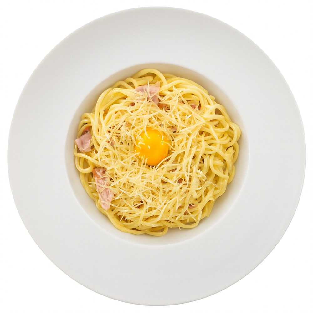 Спагетти, Бекон, Сливки, Пармезан, Яйцо.