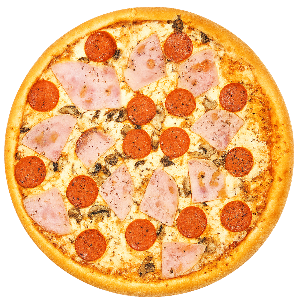 Соус, Сыр моцарелла, Сыр пармезан, Шампиньоны, Ветчина, Пепперони, Соус шрирача. 32см.