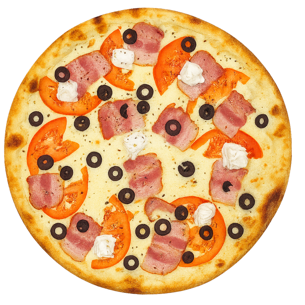 Бекон, Помидор, Маслины, Сыр фета, Сыр моцарелла, Соус бешамель,