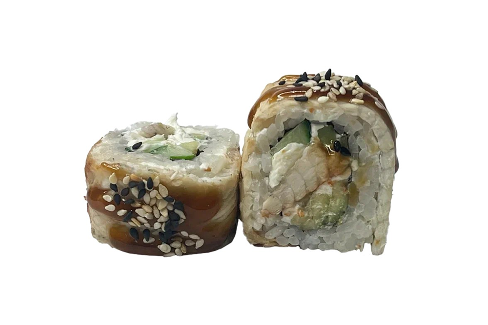 Ролл в филе угря, с начинкой сливочным сыром, огурцом, угорь и авокадо. 8шт