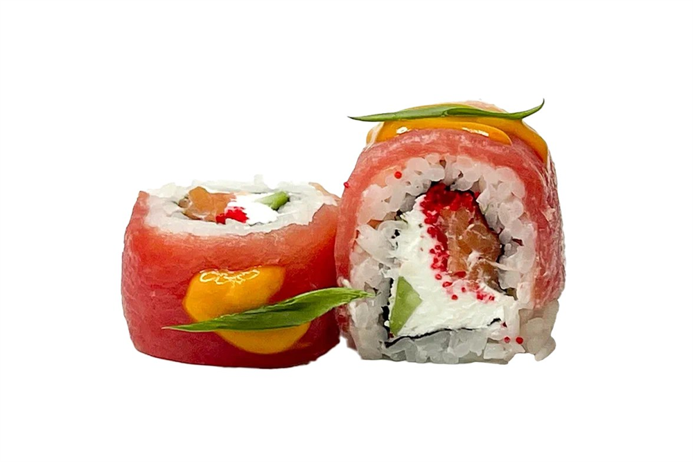Квадратный ролл в филе тунца с двойным сливочным сыром, авокадо, лососем и тобикой. 8шт