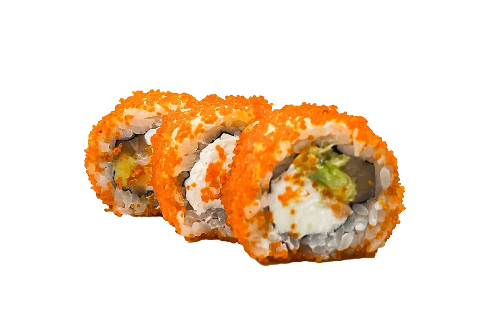 Круглый ролл в оранжевой тобике с лососем, сыром и авокадо. 8шт