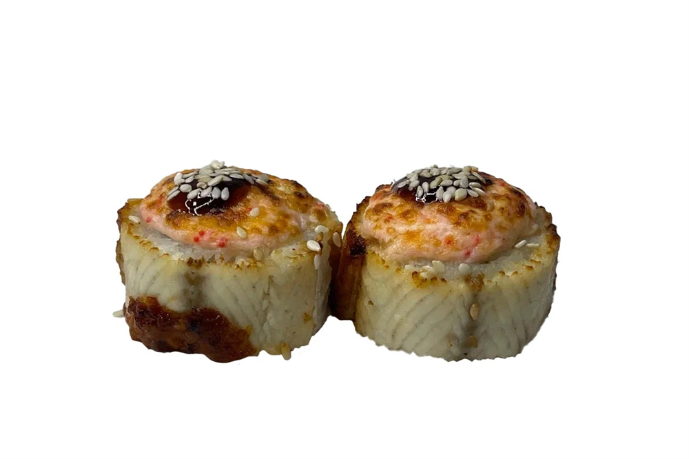 Запеченный ролл в угре, с начинкой сливочным сыром, авокадо, сверху запеченной шапочкой с ноткой чеснока и полит унаги соусом. 8шт