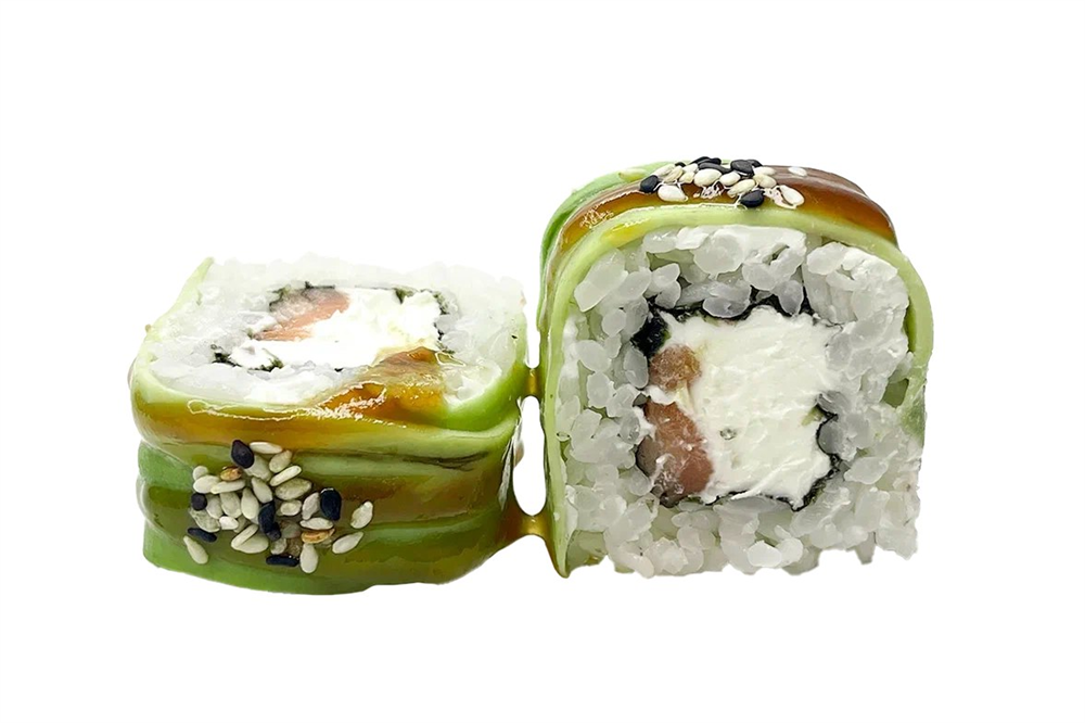 Квадратный ролл в спелом авокадо с двойным сливочным сыром и лососем. Полит унаги соусом и кунжутом. 8шт