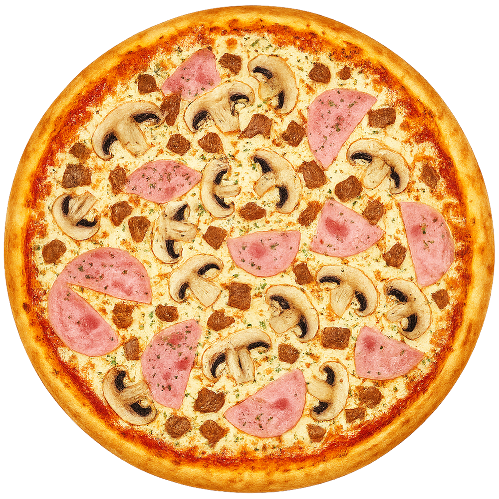 Соус, Сыр моцарелла, Язык отварной, Курица, Бекон, Ветчина, Шампиньон. 32см.