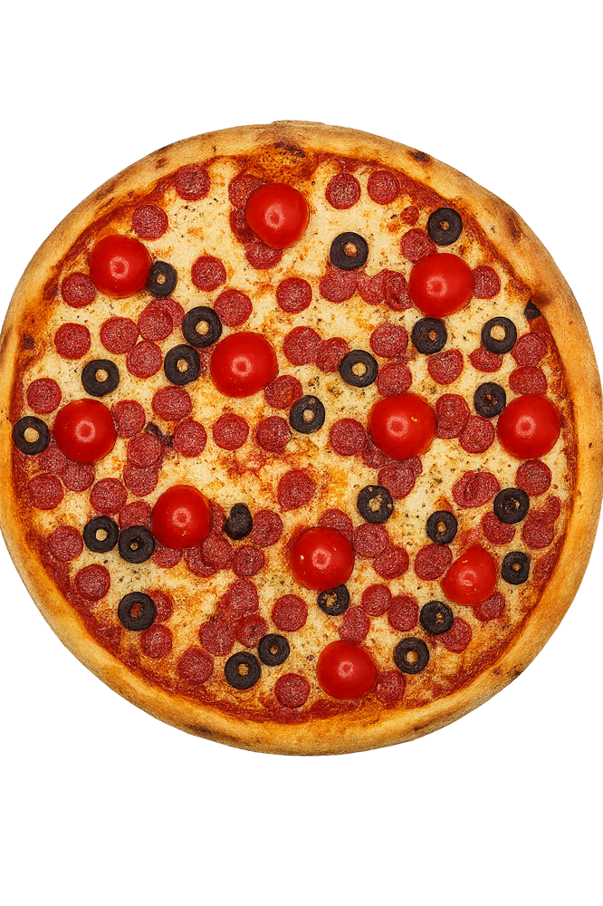 Колбаски, Помидор черри, Маслины, Пицца соус, Сыр моцарелла