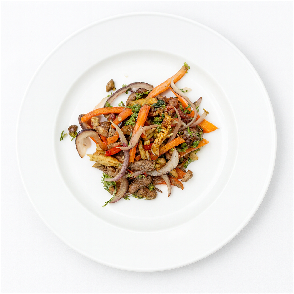 Запеченая говядина слайсами, красный перец, красный лук, помидоры, красная фасоль, кинза, масло растительное, приправы.