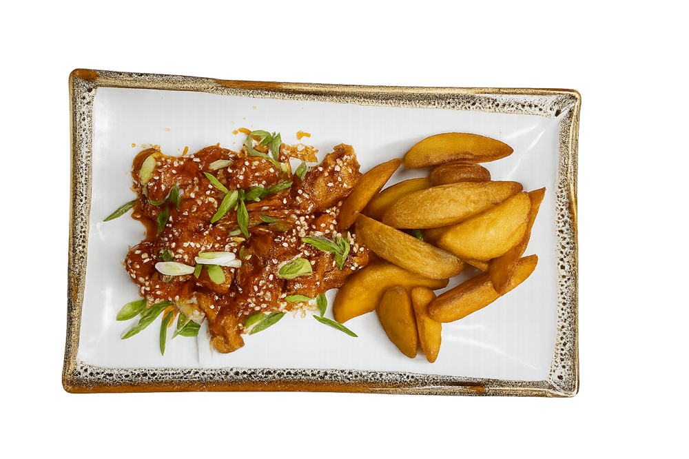 Хрустящая свинина в панировке во вкуснейшем кисло-сладком соусе, подается с картофельными дольками и французской булочкой.