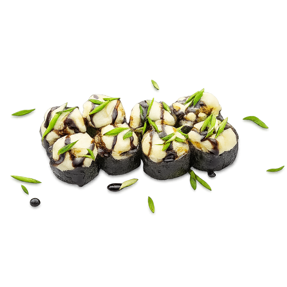 Рис, Сливочный сыр, Огурец, Зелёный лук, Помидор черри, Лист салата, Тигровая креветка, Бальзамический крем. 8шт