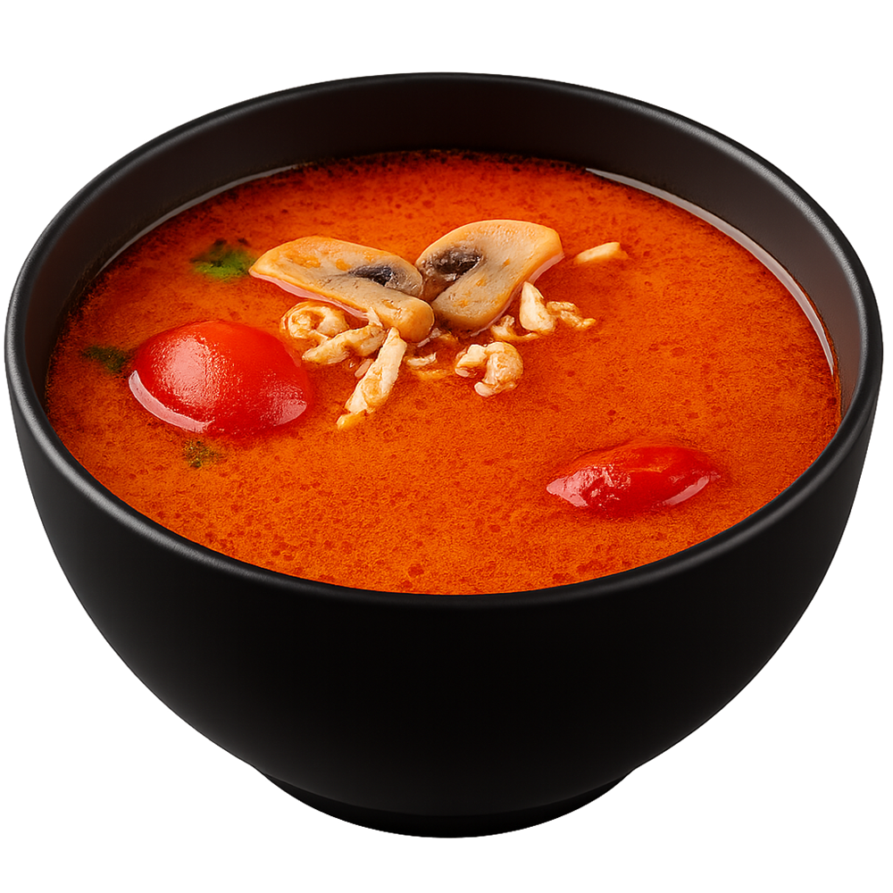 Традиционный острый Тайский суп на кокосовом молоке с куриным филе и рисом.
