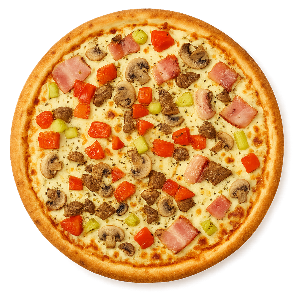 Соус, Сыр моцарелла, Шампиньоны, Бекон, Болгарский перец, Помидор, Говядина, Курица. 32см.