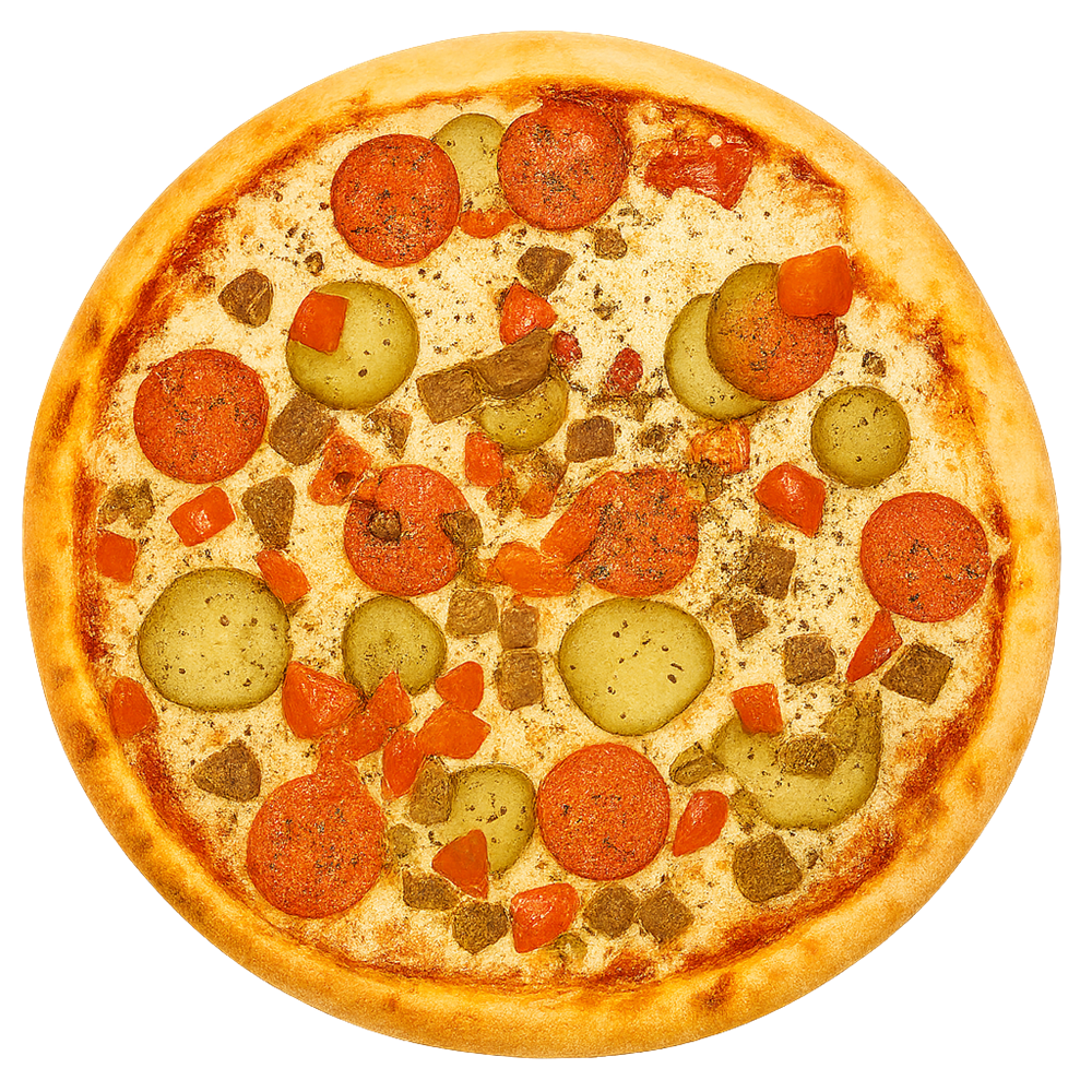 Соус, Сыр моцарелла, Пепперони, Говядина, Халапеньо, Огурцы маринованные, Помидор. 32см.